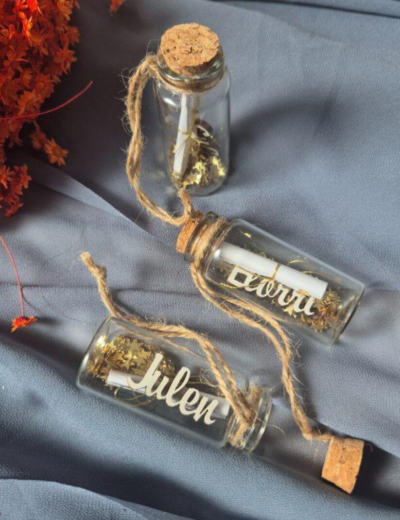 Cada botecito contiene una historia, un deseo o un mensaje especial. Es un detalle capaz de emocionar, sorprender y convertirse en un recuerdo duradero. Su estética delicada y su toque artesanal lo hacen perfecto para acompañar los momentos más importantes de tu vida.