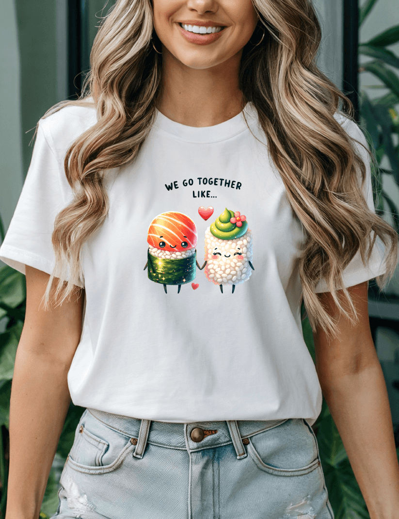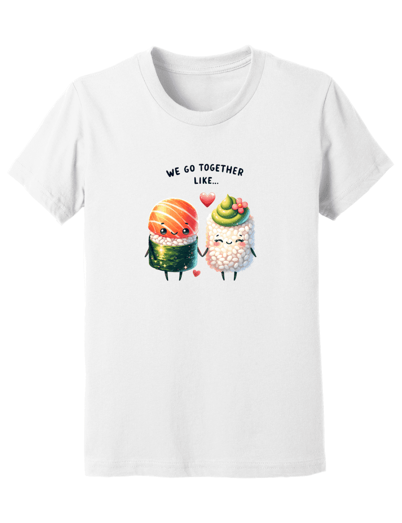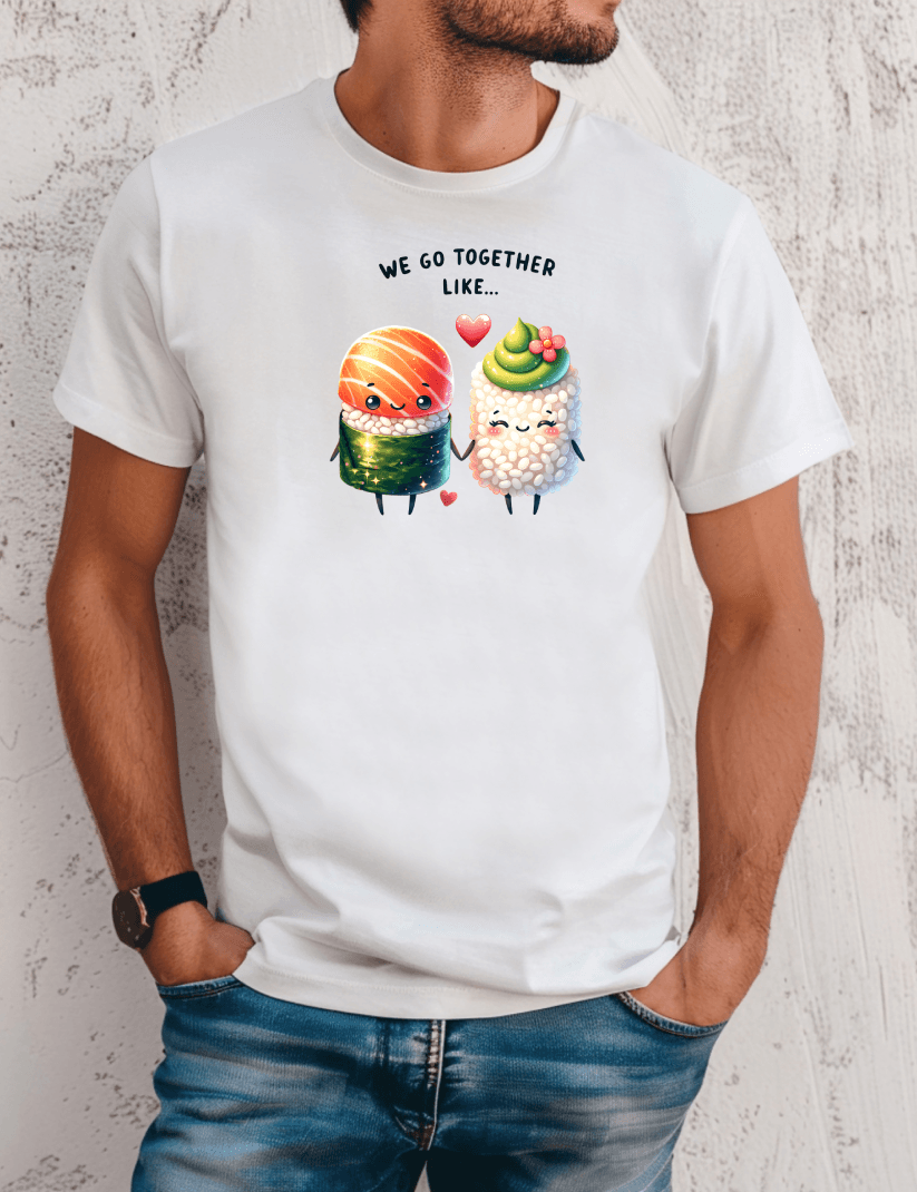 Celebra tu amor friki con esta camiseta especial de San Valentín. El diseño presenta un sushi hombre envuelto en alga y un sushi mujer hecho solo de arroz, acompañados del texto «We go together like…». Perfecta para los amantes de la comida japonesa y los detalles creativos, esta camiseta es el regalo ideal para tu pareja. Sorpréndelos con un detalle único que les recordará lo inseparables que son, ¡como el sushi hombre y el sushi mujer!