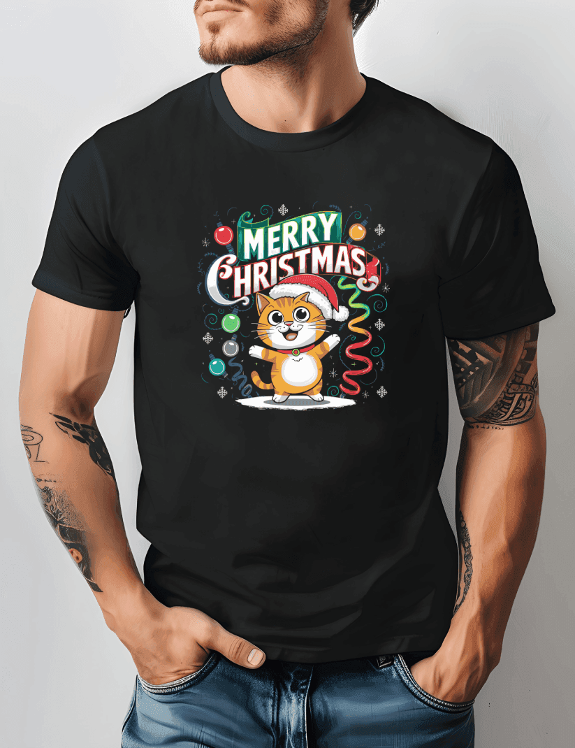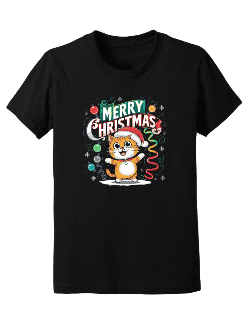 Este encantador diseño muestra a un alegre gatito con gorro de Santa rodeado de adornos, copos de nieve y serpentinas coloridas, junto al mensaje «Merry Christmas». Perfecto para los amantes de los gatos y de la Navidad, transmite un espíritu festivo y divertido que es ideal para la temporada.