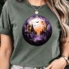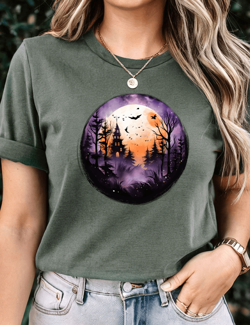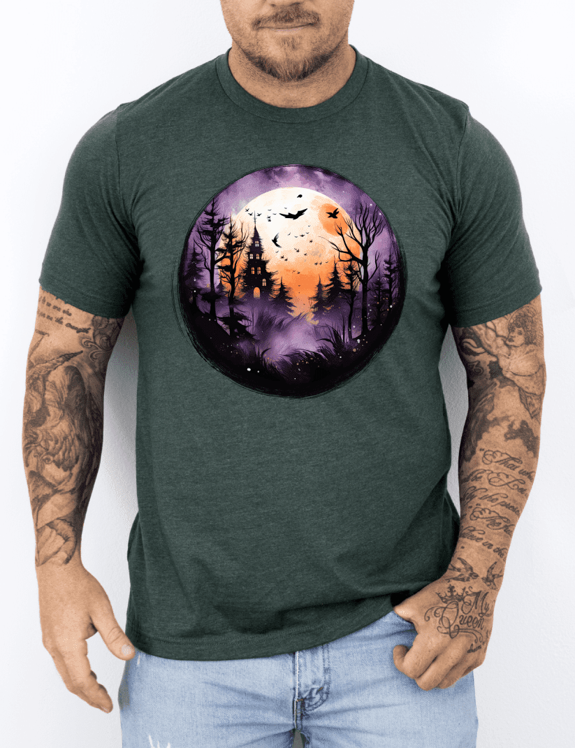 Lleva el espíritu de Halloween contigo con esta increíble camiseta que presenta un impresionante diseño circular de un castillo embrujado en medio de un paisaje oscuro y misterioso. El contraste entre los colores púrpura, negro y naranja del atardecer le da un toque vintage y atractivo, perfecto para los amantes de lo sobrenatural y las festividades de octubre. Confeccionada en algodón suave y cómodo, esta camiseta es ideal para destacar en cualquier reunión de Halloween o para los días casuales donde quieras mostrar tu lado más oscuro y mágico. ¡Hazla tuya y prepárate para disfrutar de las noches más escalofriantes del año!