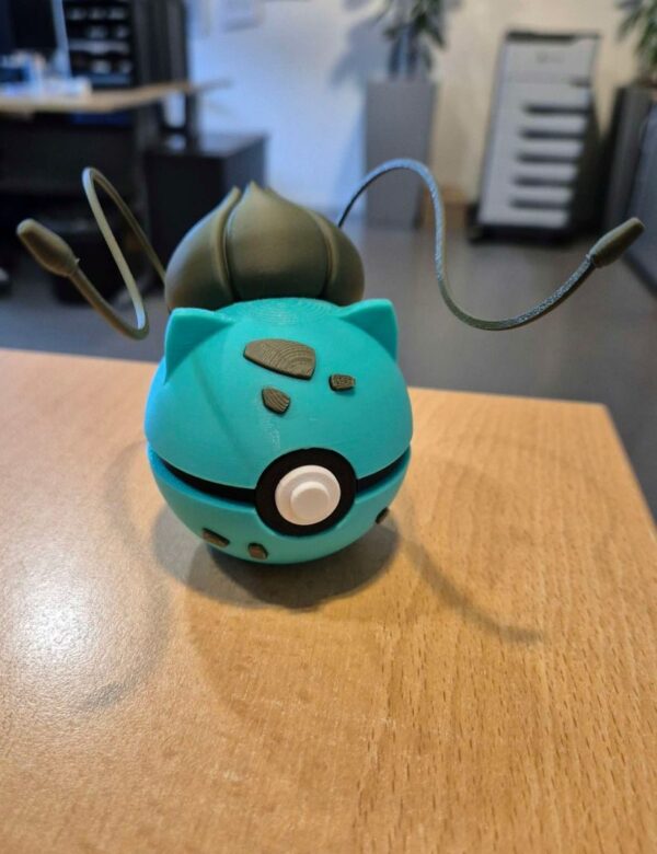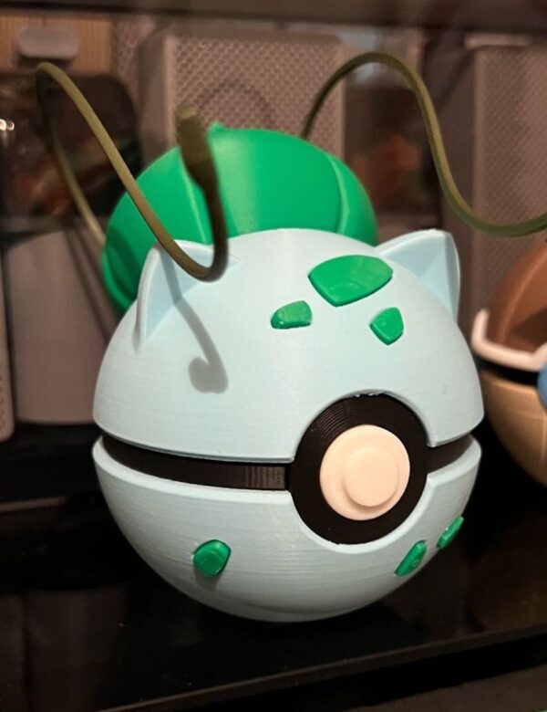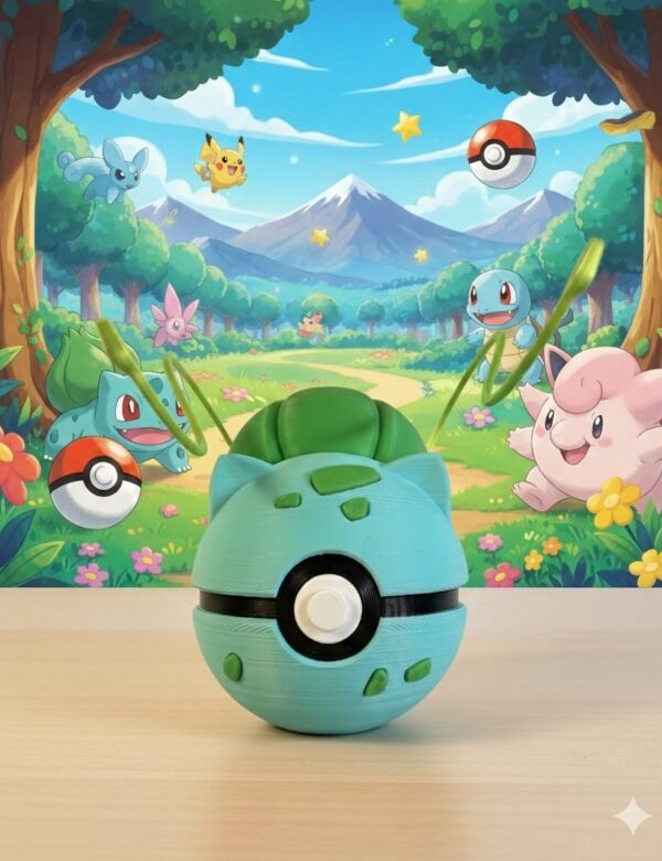 Por eso creamos esta Poké Ball edición Bulbasaur: una pieza que fusiona el diseño icónico de la Poké Ball con los rasgos más reconocibles de Bulbasaur. El bulbo con sus lianas brotando en la parte superior, las orejas puntiagudas, las manchas verdes características sobre el verde menta de su cuerpo y el botón central clásico se integran en una esfera que cualquier entrenador Pokémon reconocerá al instante.