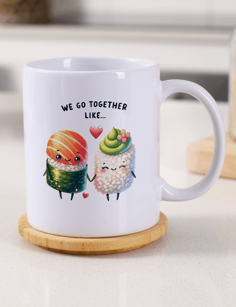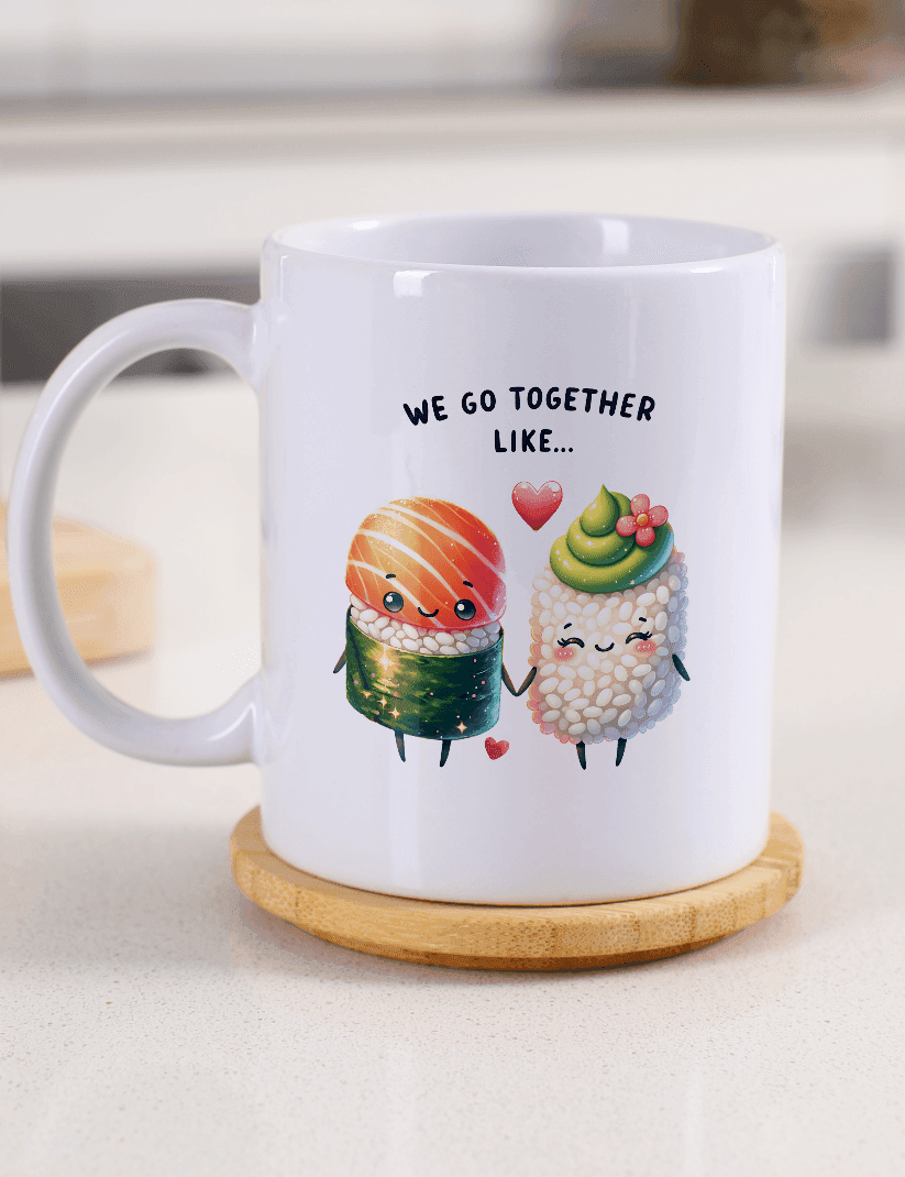 Celebra tu amor friki con nuestra taza especial de San Valentín. Presenta un diseño divertido con un sushi hombre envuelto en alga y un sushi mujer hecho solo de arroz, acompañados del texto ‘We go together like…’. Ideal para los amantes de la comida japonesa y los detalles creativos. Sorprende a tu pareja con un regalo único que les recordará lo inseparables que son, ¡como el sushi hombre y el sushi mujer!