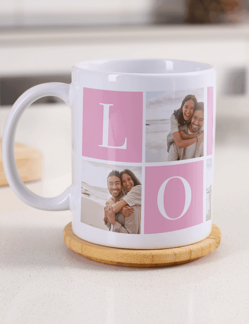 Captura tus momentos más especiales con nuestra taza personalizada. Este diseño único incluye espacio para 4 fotos y la palabra ‘Love’ en un hermoso tono rosa. Ideal para regalar a esa persona especial, creando una taza llena de recuerdos y cariño. Personalízala con tus fotos más queridas y celebra el amor de una manera única y personal.